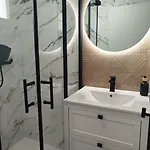 Bathroom facilities also include a separate toilet and a shower. There are hairdryers and towels for guests' comfort.